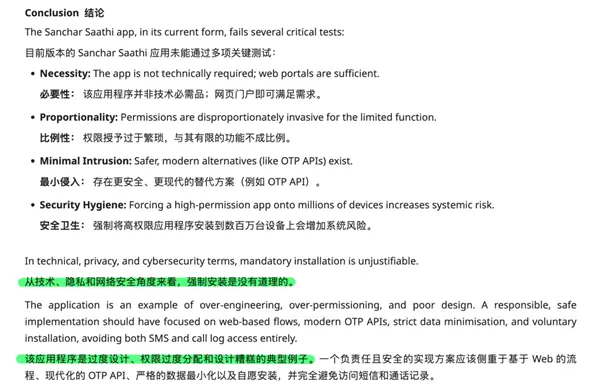 最后,sflc.in 也给出了结论,无论是技术、隐私还是网络安全,强制大家去安装 Sanchar Saathi 应用都是没有道理的,甚至还将这款应用评价为权限过度分配和设计糟糕的典型例子。