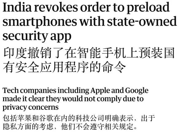 起因是这样的,印度政府在 11 月 28 日强制要求包括苹果、三星在内的所有手机厂商,必须在 90 天内预装一款叫做 “Sanchar Saathi”(通信伙伴)的网络安全应用。