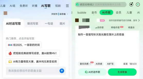 对于普通大众来说,AI 音乐的生产力进化更直观地体现在流媒体平台的 AI 功能 “上新” 上。在网易云音乐等主流流媒体平台,有为 AI 歌曲建立的音乐专区。而打开 QQ 音乐、酷狗音乐,只需要轻轻滑动顶部菜单栏就能轻松找到 “AI 写歌”“AI 唱” 功能。