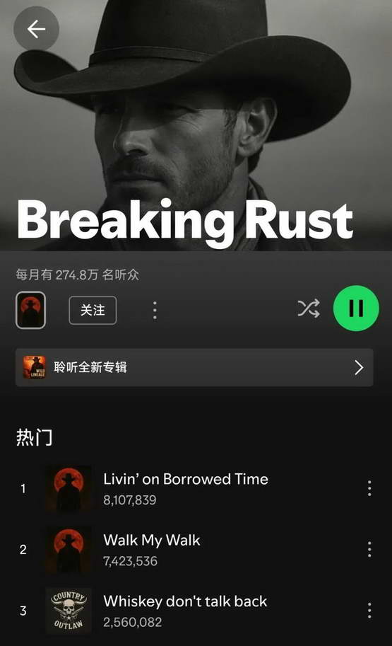惊蛰研究所还注意到,《Walk My Walk》的署名艺人 Breaking Rust 在 Spotify 上已发布超过 10 首歌曲,其中热度最高的 3 首歌曲总播放量已经超过 1800 万次。这意味着,Breaking Rust 这个署名背后的创作者可能仅凭 3 首 AI 歌曲,就在单一平台获得了超过 7.2 万美元(约 51 万人民币)的收入。