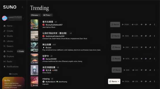 Suno 上的热门中文 AI 歌曲