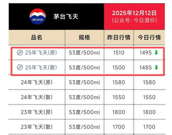 25 年飞天茅台散装,最新报价 1485 元;