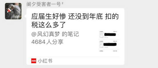 在小红书看到一个应届生晒工资单,主要是抱怨交税太多,但是因为截图里 20 万出头的年收入以及不小心露出了公司名字,很快就被热心网友和闻声而来的同事检举到领导那里了??
