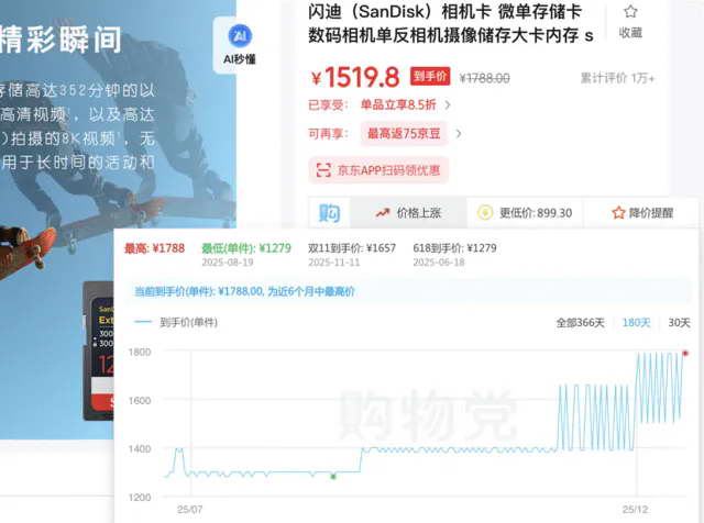 举一个例子,销量比较好的闪迪 V30 标准 128GB 容量 SD 卡,这款中低端走量,6 月份的时候卖 170 元,10 月份突然涨价,现在 219 元。