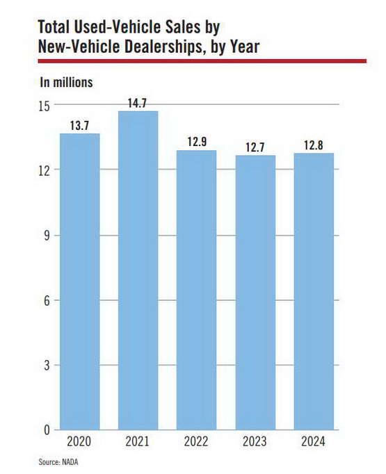 先来说渠道。在美国,你想买一台二手车,其实可以直接找官方授权的经销商,也就是 4S 店。在 2024 年,全美通过授权经销商销售的二手车就有 1280 万辆,占了整个市场的 32% 。
