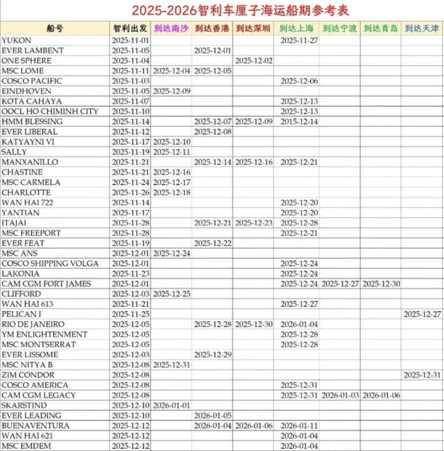 下面这张表很清晰地标明了智利车厘子到港的日期。