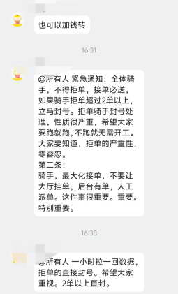 有骑手直接分享了群消息,拒单两单以上者立马封号。
