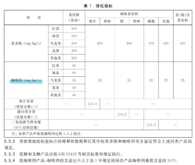 目前,奶茶们适用的现行国标《 茶饮料 》,已经是 2008 年出台的。 里面只对这些茶饮的咖啡因下限做了规定,咖啡因含量要达到 35mg/kg 以上。