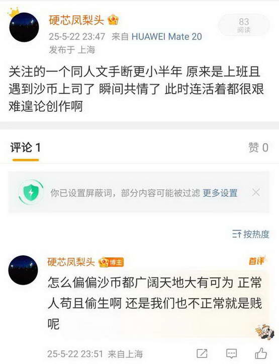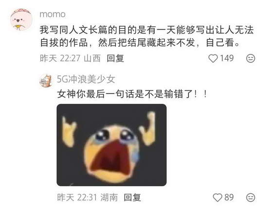 @花杀七十三:有个挺有意思的事儿是我 2024 年年底觉得好玩儿写了个同人,到 2025 年 1 月的时候断更了,在接下来一整年中,那篇文一直在被哭坟,一开始是留言哭坟,后来是私信里哭坟,在后来其它一些平台也有哭坟的。我也经常想抽时间写但完全没有落实过。