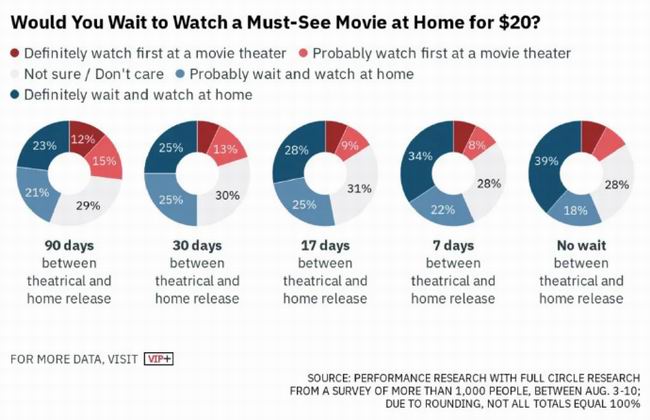 《综艺》8月对上千名观众进行的最新调查显示,如果有大片在影院放映的同时进行线上付费点播,有高达57%的观众更倾向于在家观看。即使大片在院线放映一个月后才上网点播,倾向于在家看的观众也有一半。而明确表示更倾向影院的观众,始终低于30%。