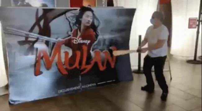 上个月迪士尼刚宣布《花木兰》院线撤档,一段视频就在外网爆红:一位愤怒的法国影院老板一棍子朝着《花木兰》的展板砸去,然后娇羞地站到了《信条》海报旁边。