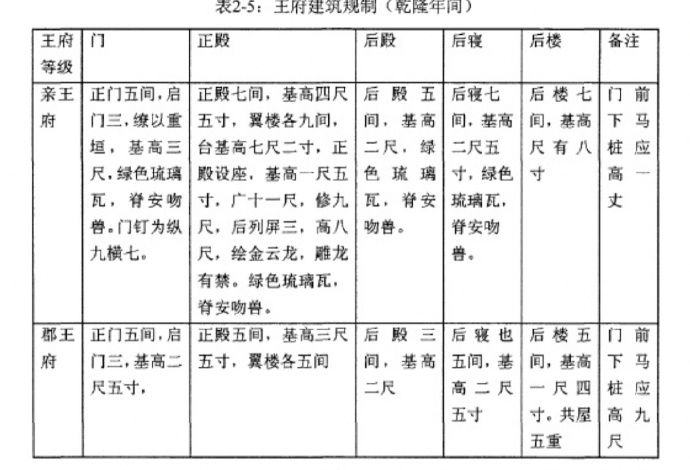 清朝末年的时候,光绪钦定的《大清会典》基本沿用乾隆时期的规定。在制度上我们也可以看到,对于宅院的名称,一般亲王与郡王的住宅可以称王府;对于府内的建筑的名称,只有王府中的主要建筑可以称殿、寝。
