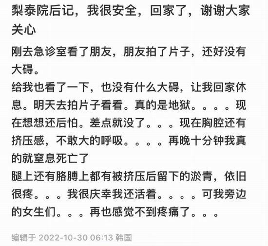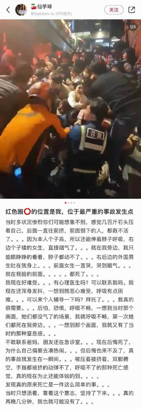 一中国人在社交平台上分享自己在梨泰院捡回一条命的经历,隔着屏幕,光看这文字就已经很窒息了。