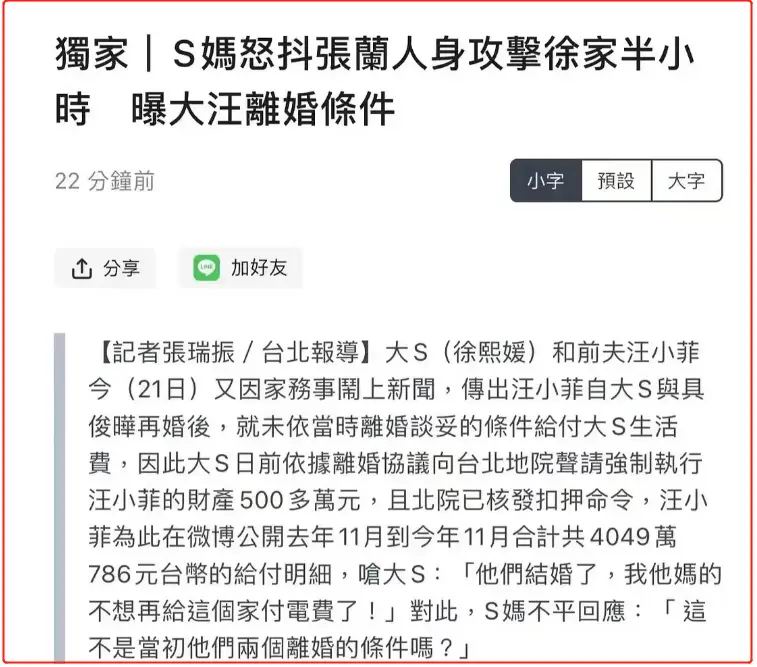 当然,汪小菲被爆出不愿意继续支付费用的事有些不体面,但大.S.直接起诉,来个强制执行,这个体面吗?