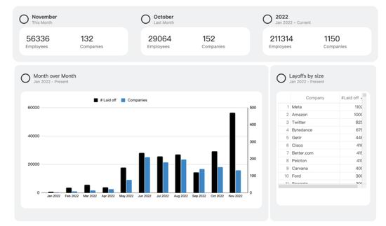 从今年二季度到目前为止,硅谷科技公司的裁员潮愈演愈烈,目前还丝毫没有停歇的意思,根据 layoffs.fyi 网站的统计数据,仅 11 月以来,就已经有 42000 名科技从业者被裁。