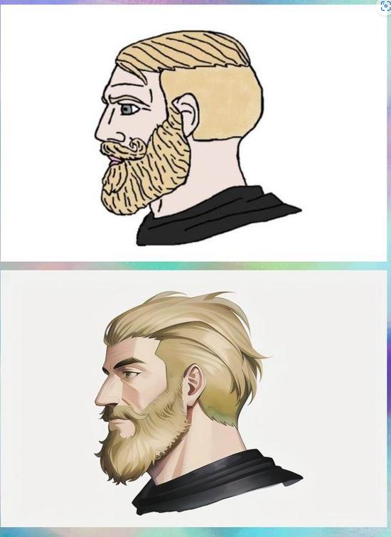 再比如著名网络猛男形象.“百万查德”Gigachad:这个像是打了类固醇的下巴…….在动漫化之后看着居然舒服多了,有没有?