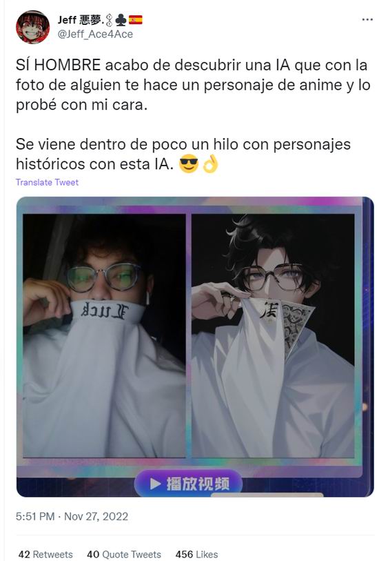 南美用户成为首批传播者:主要是一些居住在南美讲西语的用户,开始关注并使用.“异次元的我”。比如.Twitter.用户.@Jeff_Ace4Ace.发了一条推文表示自己.“发现了这个.AI”,能够把任何照片变成动漫形象:
