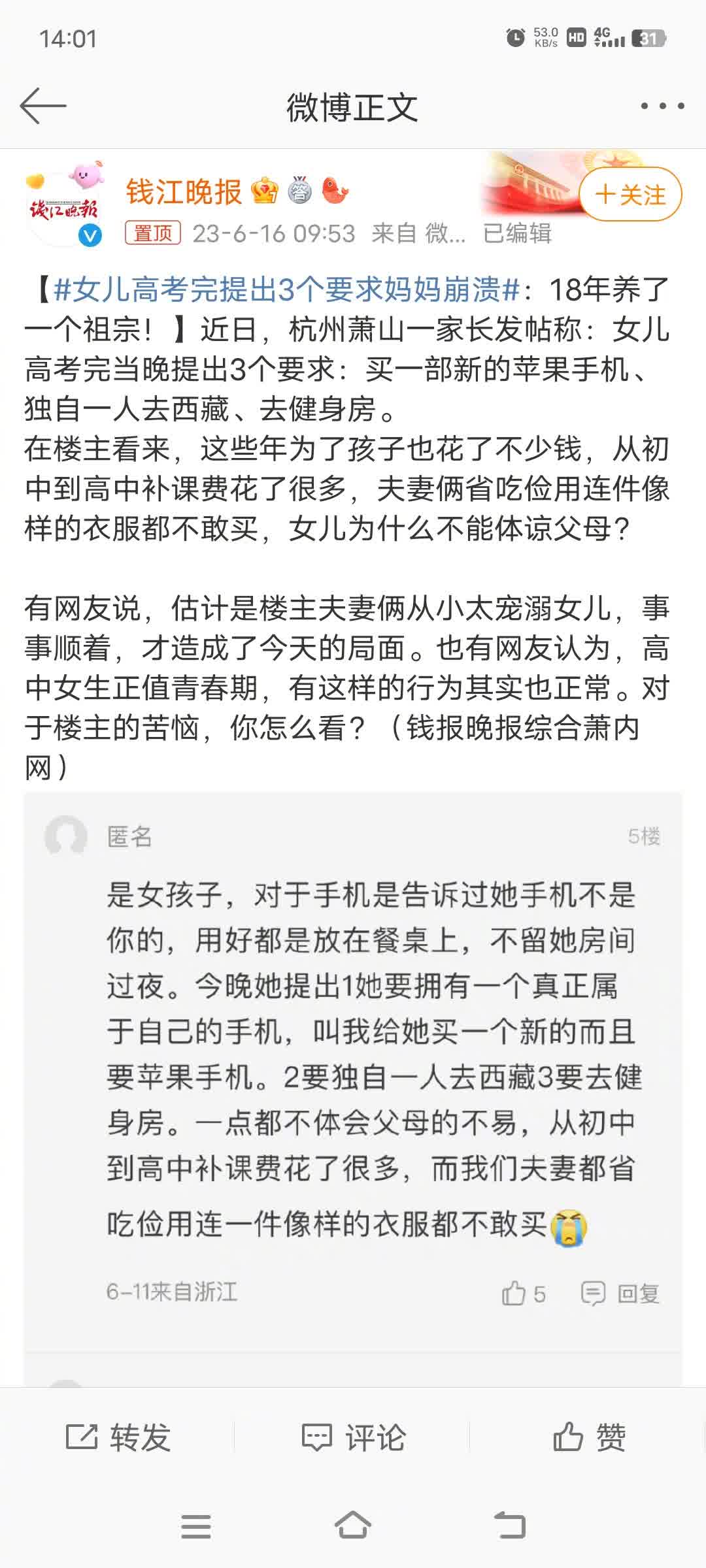 @杭州金融女民工:#女儿高考完提出 3 个要求妈妈崩溃#