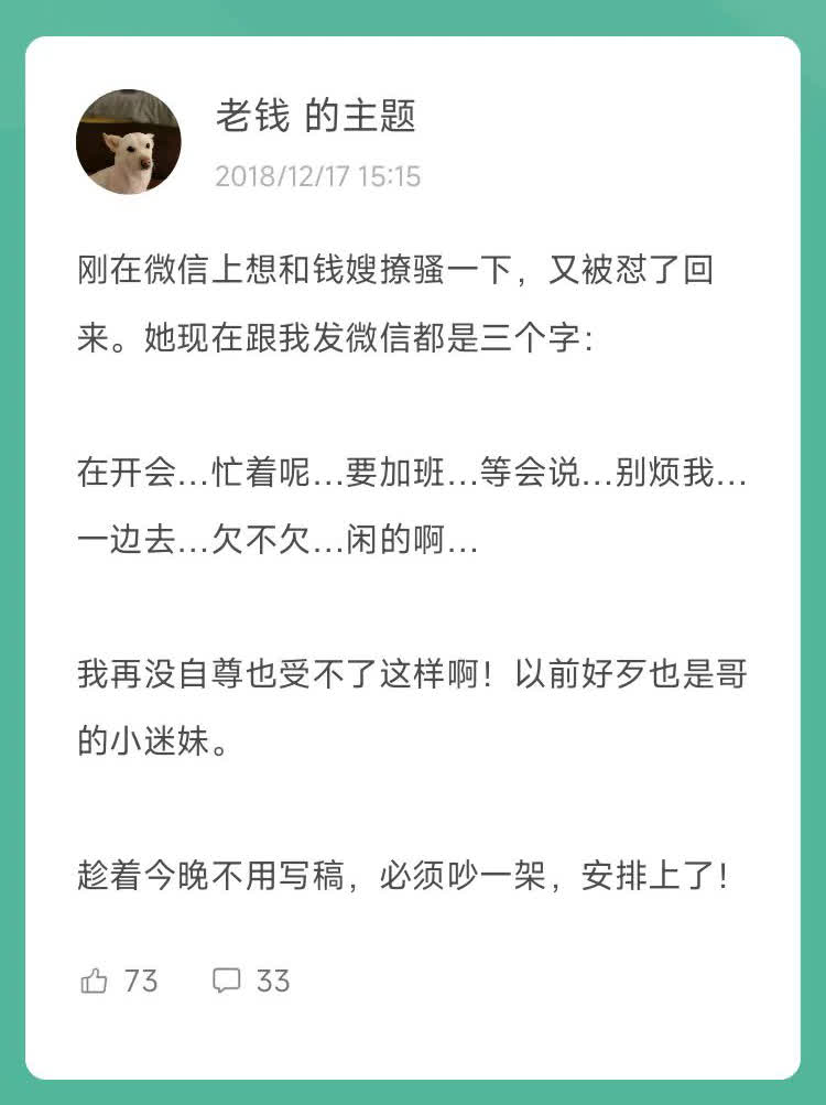 那时候我自己在家写稿,一闷就是一天,然后等女搬砖工回家,开始故意找茬和她吵架,活脱脱成了居家怨妇。