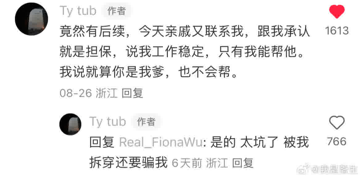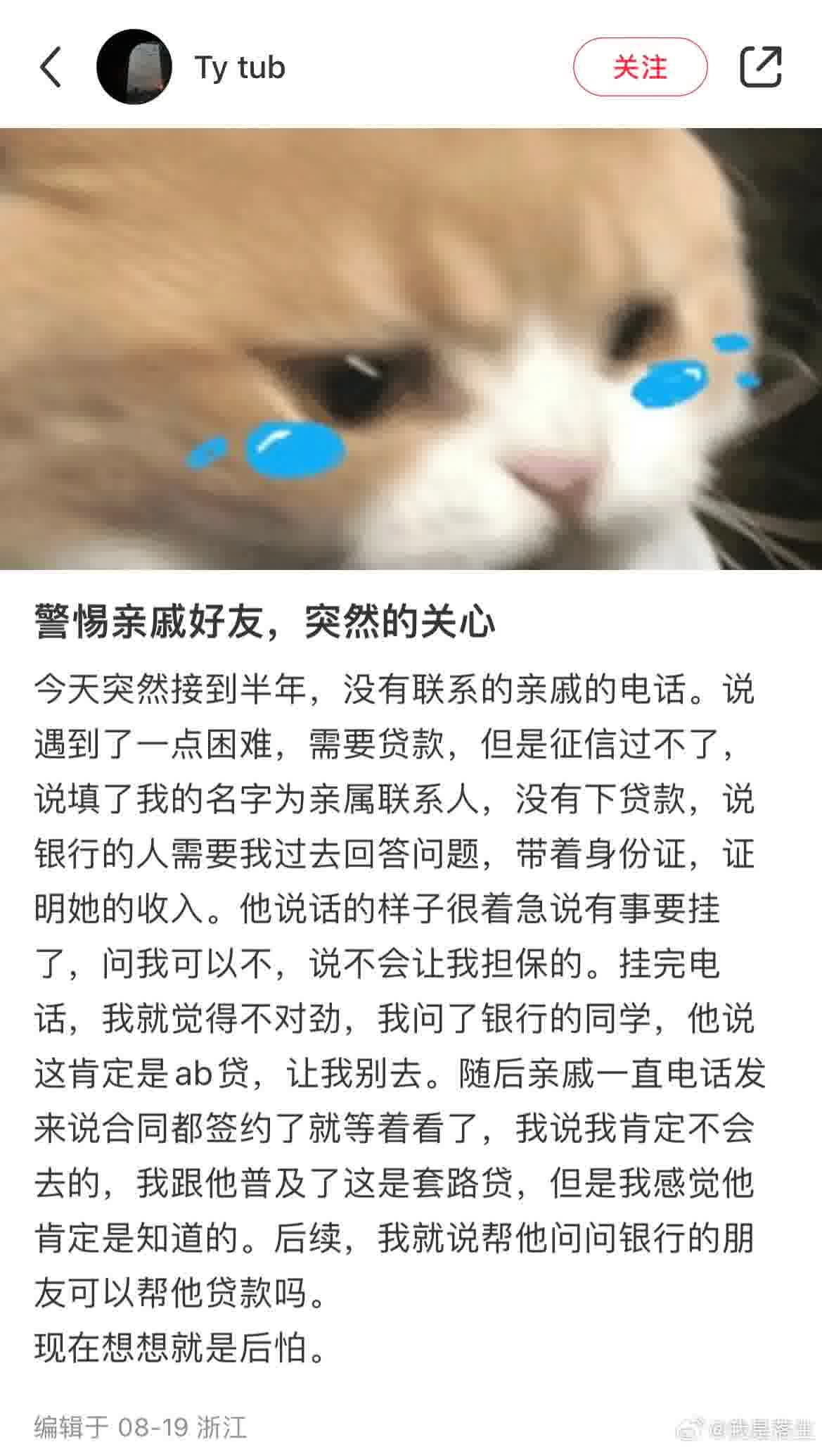 @吃个淡萝卜:我几年前也差点遇到,当时有个电话给我,说我表哥在他地方贷款,来问我一些问题,让我做个见证人之类的… 我直觉就不对劲,就说不清楚不知道不愿意,那个人说 “不是你亲戚么”,我说亲戚也分亲疏的,我不愿意… 后来不了了之… 几个月后,我才知道我表哥赌球,欠了高利贷几百万… 真的后怕…