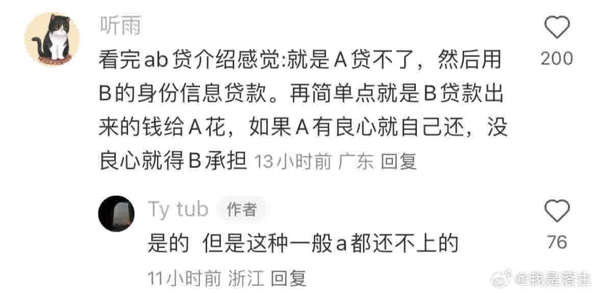 @菊厂刘掌柜:还是有同学不懂什么叫 AB 贷,其实就是 A 的资质不行,又着急用钱,银行不会给钱,然后被 “提醒” 说可以找朋友 B 来担保或者增信,B 来了之后不太了解只是给予信任 A 的情况下,给 A 担保下了一笔钱。