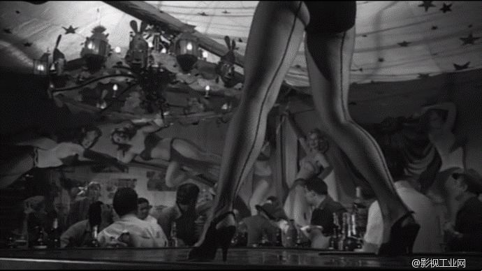 正常都是广角俯拍来展示女人的美腿,但是奥森·威尔逊在电影中使用了仰拍,丝袜美腿的特写与背景的女性装饰交相呼应,构建了一个狂欢情欲的场景。个人认为奥森·威尔逊及其善于拍摄美腿,最后再推荐其《上海小姐》剧照,来自丽塔·海华斯: