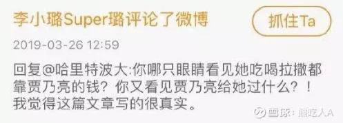 有着众多小号的李小璐一时脑热,拿自己的大号回复了一条:"你哪只眼睛看见她吃喝拉撒都靠贾乃亮的钱?你又看见贾乃亮给过她什么?"