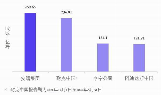 财报显示,2022 年上半年,安踏集团实现总收入 259.65 亿元,同比增长 13.8%,收入体量相当于同期的 1.1 个耐克中国、2.1 个李宁、2.13 个阿迪达斯。
