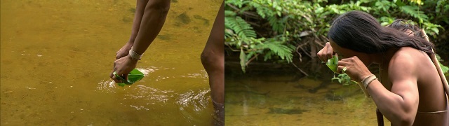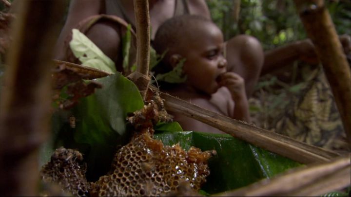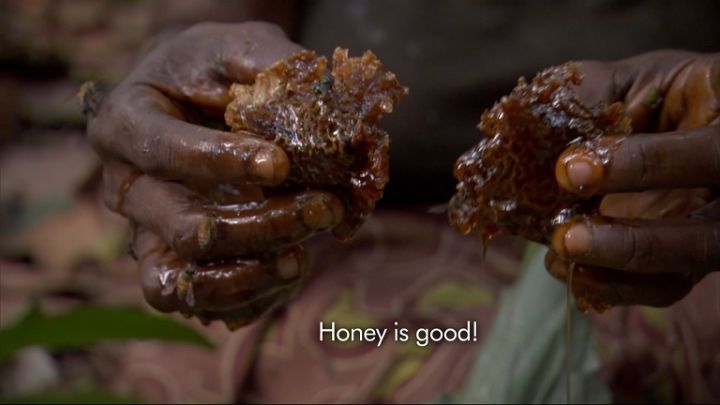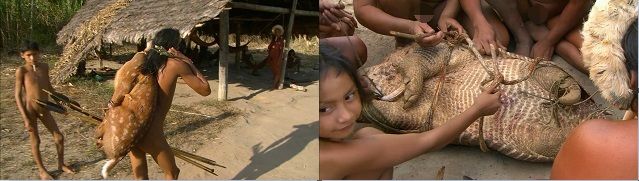上图中射到野物的是他们中最好的猎手"莫宁",他的第一个妻子怀孕了,第二和第三个妻子在照顾和干活,而他需要寻找更多的食物回来养家,她的妻子们在吃仅剩的一点肉--猴子干。