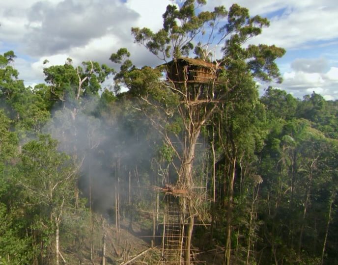 他们手里拿的这一捆东西是箭,这是他们赖以生存的工具,射出去以后即使卡在30米高的树上一般也都会辛苦的找回来,用植物的茎编一个绳圈套在脚踝就能爬上去。