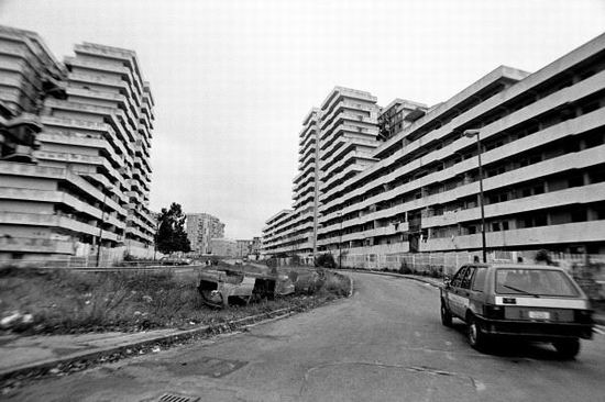 曾经象征战后经济高度繁荣的意大利那不勒斯高层住宅区.Vele.di.Scampia.破败不堪,讲述意大利黑帮的人气影片《格莫拉》便在此实景拍摄,部分塔楼如今已爆破