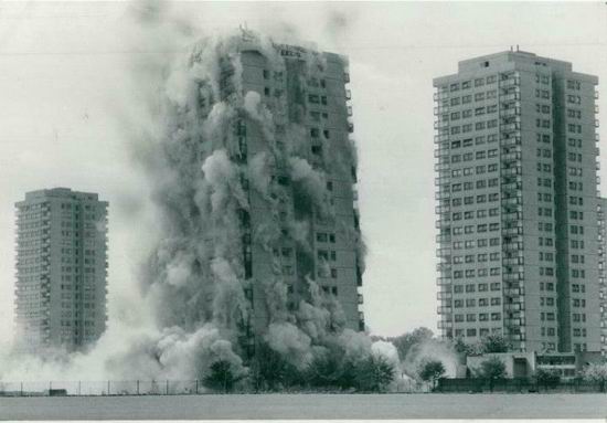 事实上,上面所列举的大楼并无明显或确定的严重结构问题。比如关于.North.Tyneside.市的.Killingworth.的.27.座楼,当局提供的拆除报告并未显示这些大楼有任何的结构问题。或者肯特郡.Medway.的.Rochester.区域高层塔楼在当时的报告中显示是因为:破坏了城市天际线,因而选择了拆除。无论如何,当时兴起的拆楼运动中,很多理由在如今看来显得颇为疯狂,似乎已经逐渐脱离一开始只是因为高层塔楼的结构安全问题,或者是街区的退化与混乱。就像是一股风潮,只管拆,可能因为太丑,可能因为太高,可能因为太乱,总之什么理由都可以。并且根本不考虑各种代价和成本。一段时间内,拆楼机日夜轰鸣,各地爆破声频起,高层塔楼开始逐渐消失在英国各大城市或者乡镇的天际线上。从一开始的十层左右住宅到后来的二十层直至三十层,无论多高,只要想拆,没有炸不掉的。当时的人们在远处欣赏爆破高楼是一件司空见惯的事,一些爆破区域设置了观景区,邀请民众和媒体到场观看高耸的塔楼顿时化为烟尘后重新恢复的蓝天与绿地。