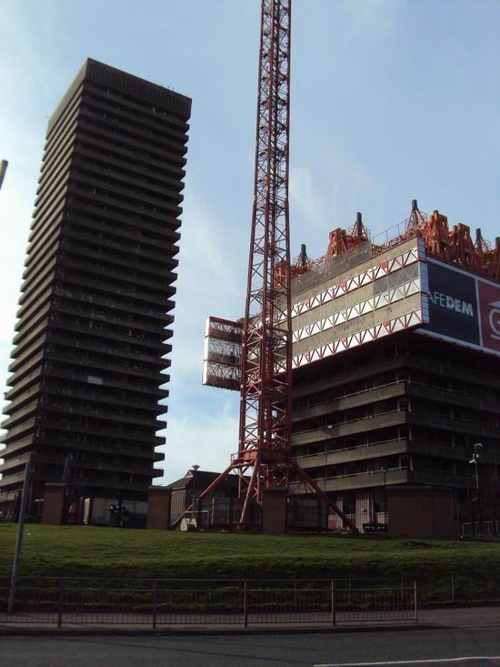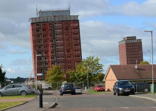 当然,拆除手段并非只有壮观的以秒为单位的爆破。比如同处格拉斯哥,兴建于.1967.年的.30.层双塔住宅.Bluevale.and.Whitevale.Towers.就使用的是被称为.Top.Down.Demolition.method.这种至上而下的机械拆除模式。虽然拆除时间会长达数月,但稳定,安全且对周围环境影响更小。(之所以选择这种模式是因为临近铁路干线,爆破会严重干扰繁忙的铁路运输服务)