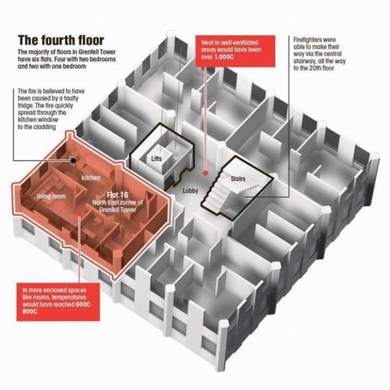 可以清晰看出大楼的设计在火灾发生时犹如一根巨型烟囱,助长了火势的迅速蔓延