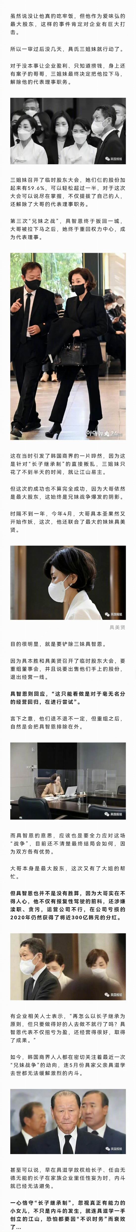 @英国报姐:韩国财阀家族又一次爆发了 “继承之战”… 去年三姐妹联手让无能大哥出局,最小的妹妹成功掌权,打破了近百年来家族贯彻的 “长子继承制”,现在大哥要卷土重来了…