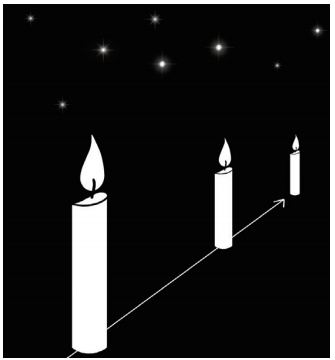 为了介绍用标准烛光测量距离的基本原理,让我们从一个在日常生活中颇为常见的现象说起。一根蜡烛,放在近处看就亮,放在远处看就暗。这是因为,我们所看到蜡烛的亮度取决于由蜡烛发出并射入我们眼中的光子数目。射入的光子数越多,蜡烛看起来就越亮;反之,蜡烛看起来就越暗。