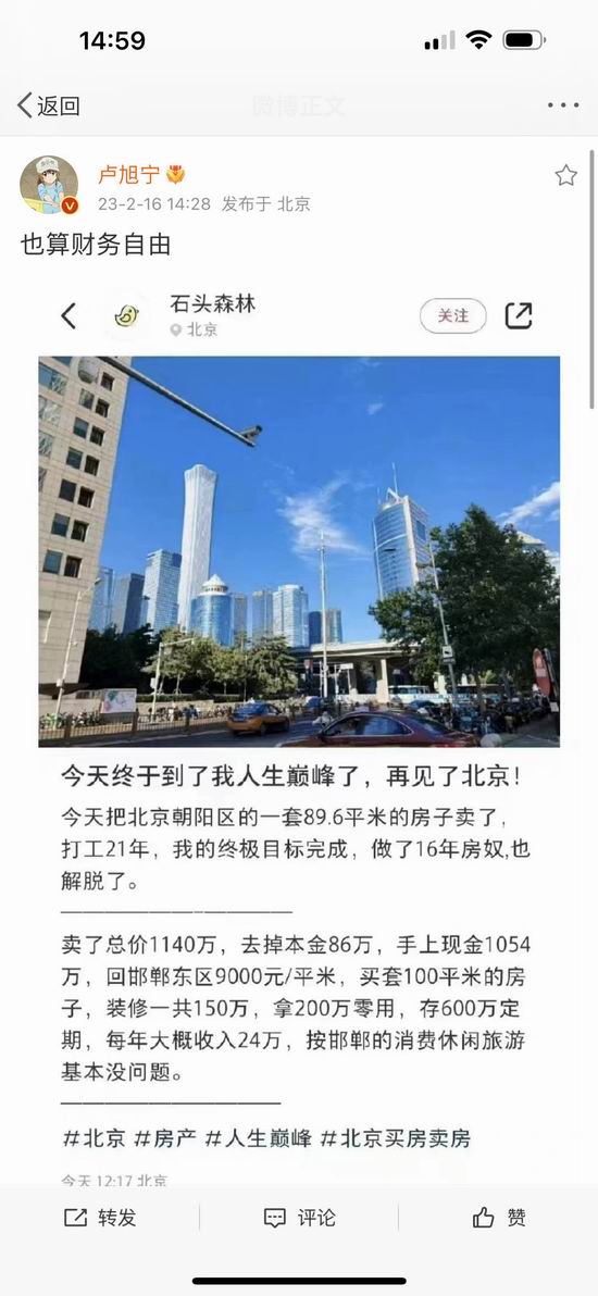@sven_shi:“他的孩子怎么办?” 我看见这句话的时候就真的感觉我们对教育的魔怔早就应该在房地产面前破灭了。事情就是个网友晒他的成功人生。他早年在北京买了套 90 平的房子,现在把房子卖了手里拿着 1000 多万的现金回老家逍遥了。