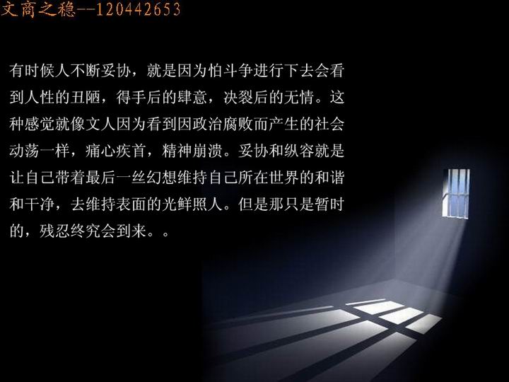 可是在残酷的现实中有多少人能够不妥协?对上级、对下级、对群众、对父母、对妻儿,甚至对手上这台电脑我们都不能够想怎样就怎样,能不妥协吗?我也是一个梦想被妥协掉了的人。bq151