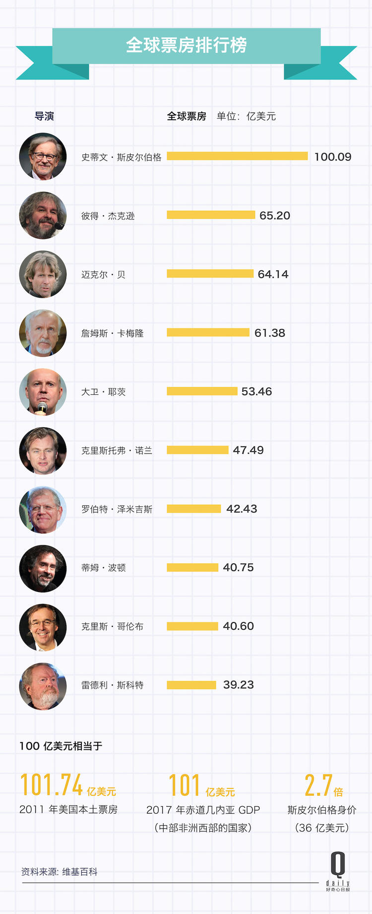 电影《头号玩家》上映以来,已经获得了 4.75 亿美元的全球票房,这使得斯皮尔伯格执导的电影全球累计票房超过了 100 亿美元。他是唯一一名达到百亿美元票房标杆的导演。100 亿美元相当于 2011 年美国一整年本土的票房,相当于 2017 年赤道几内亚全年的 GDP,还是斯皮尔伯格个人身价的 2.7 倍多。