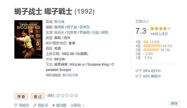 上面这几部港产片随便拿一部出来都是如雷贯耳的,都是代表港产片最高水平的。那一年的香港影坛是星爷、李连杰、成龙瓜分的天下,连成龙在那一年都一改以往的武侠风格,改拍《双龙会》了。而《蝎子战士》这种跟成龙早期风格非常相似的,武术屌丝努力成长为大侠的片,怎么吸引观众的目光?而且主题还搞得不伦不类,搞个大反派“蝎子战士”作为主题,故事情节比较单一,搞笑情节也严重不足,所以票房失败也就是必然的了。所以估计除了少数功夫迷观众能够对它兴趣,普通观众忽视它也是很正常的了。