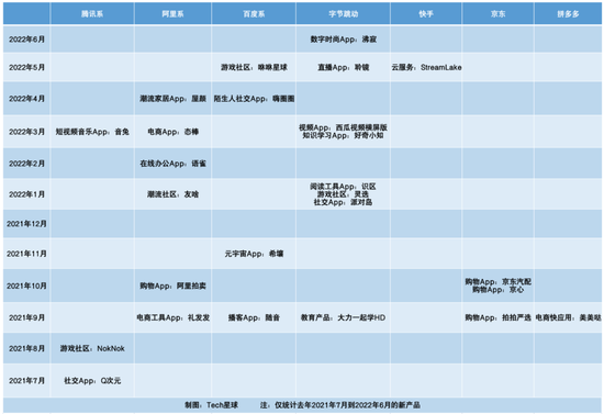 图注:2021 年 7 月到 2022 年 6 月间,主要互联网大厂公开推出的新 App 一览表。