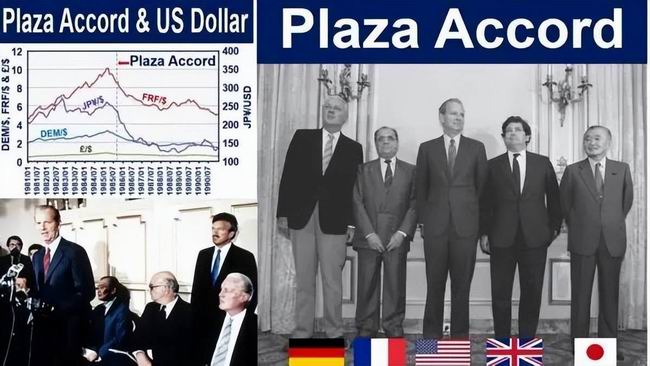 1985.年.9.月,实在熬不住的美国召集德国、法国、英国和日本在纽约广场饭店开了个会,这就是著名的."广场会议"。