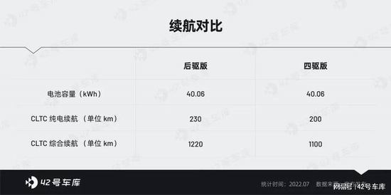 四驱版车型在.200.kW.后电机基础上增加了一台.130.kW.的前永磁同步电机。CLTC.工况下纯电续航.200.km,综合续航能力能够达到.1,100.km。