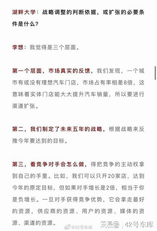 2020.年李想曾在湖畔大学的访谈中透露:「一个城市有理想汽车门店和没有门店,市场占有率差.8.倍,这意味着实体门店可以大大提升汽车销量。」