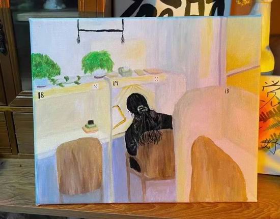 但白林莎不这样想。她几乎认识在自习室的每一个人,也把所有的闲暇时间都花在了自习室。她曾经撮合了自习室的一对情侣,女孩是她的初中同学。她还给第一个客户拍了一张在自习室学习的照片,做成了一幅油画送给她。照片里,窗户边的一道余晖洒了下来。