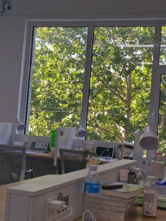 白林莎的自习室,走的是宽敞、明亮的风格。主色调是轻松的绿色,灯是绿的,日历是绿的,窗子外还有三棵法国梧桐。这与大城市里很多逼仄的小隔间自习室不同,那种很像《请回答.1988》里的不睡觉自习室,每个人被隔在小小的方格,又隐藏在黑暗中。