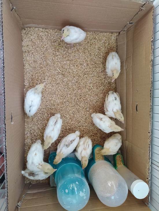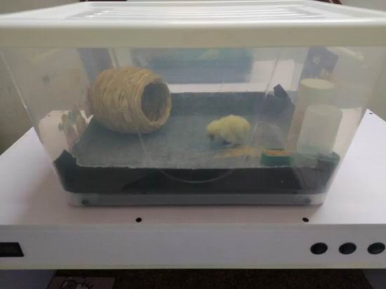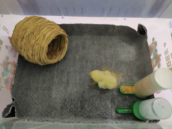 捡的别人不要的收纳箱,刚好给小鸡住,哈哈…