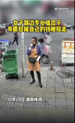 10月28日,湖南株洲。一女子街边嗑瓜子毫无察觉钱掉地上,目睹钱被捡走的视频,引发网友议论。