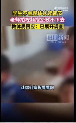 近日,因学生不会整体认读音节,江西新干县一小学老师拍视频质问家长"怎么辅导的"。视频中,一名女教师边拍视频边对着学生说:"让你们家长看看,这么多人,什么是整体认读音节都不知道。家长们怎么在教?怎么在辅导?我上不下去了这个课。"