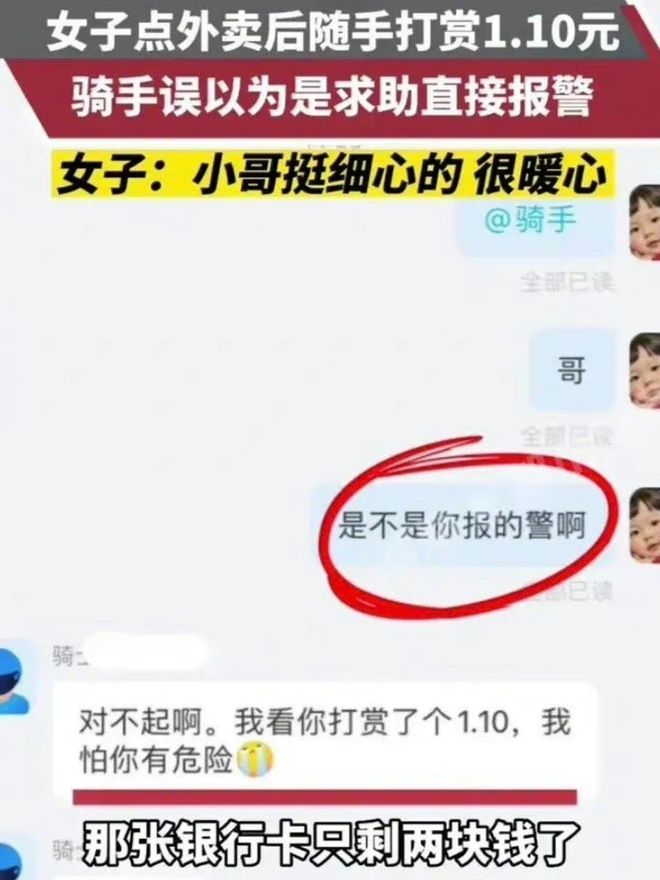 事后,陶女士从2元余额的银行卡里随手输了1.1元打赏费给外卖员。没想到不一会儿,物业和民警都来敲门,询问是不是遇到了危险。